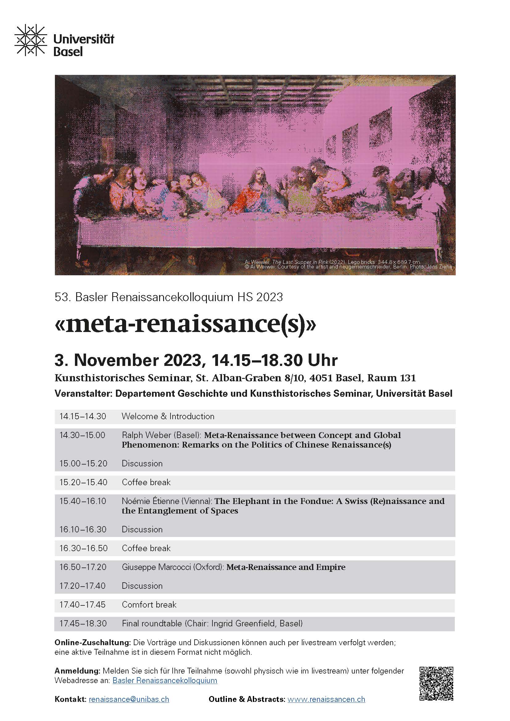 Das Kolloquium versteht die Renaissance als doppelgesichtigen Projektionsraum: Als Epochenkonzept sowie als Reflexionskategorie, als Zeitraum, in dem wir den Beginn der Moderne lokalisieren und zugleich seine ständig wachsende Fremdheit konstatieren, aber auch als Chance, die für die historischen Wissenschaften zentrale Epochengrenze zwischen Mittelalter und Neuzeit weiter zu dynamisieren. Aus materiellen wie wissenschaftsgeschichtlichen Gründen liegt dabei der Fokus auf dem 14. bis 17. Jahrhundert.