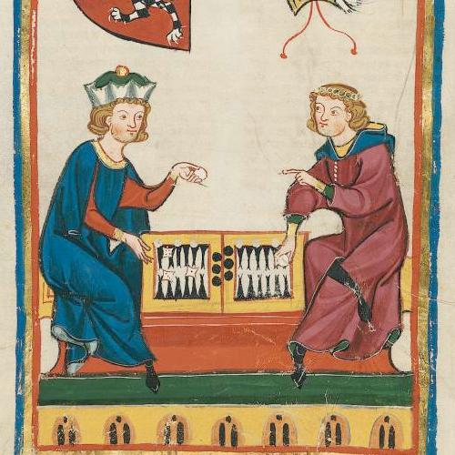 Page 262v, entitled «Herr Gœli», is named after a member of the Golin family originating from Badenweiler, Germany. «Herr Gœli» may have been identified either as Konrad Golin (or his nephew Diethelm) who were high ranked clergymen in 13th century Basel. The illustration, which is followed by four songs, shows «Herrn Gœli» and a friend playing a game of Backgammon (at that time referred to as «Pasch», «Puff», «Tricktrack», or «Wurfzabel»). The game is in full swing, and the players argue about a specific move.