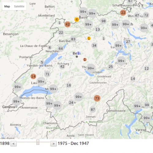 We developed an interactive visualization of the migration flow of (mostly jewish) refugees migrating to or through Switzerland between 1898-1975. We used the API of google maps to show the movement of about 20'000 refugees situated in 535 locations in Switzerland.
