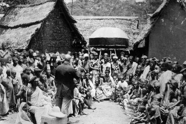 Prédication du missionnaire Fritz Ramseyer devant une assemblée de village en Côte-de-l'Or (actuel Ghana). Photographie, vers 1890 (Archiv Basler Mission, Bâle, QD-30.042.0042). Extrait de l'article Colonialisme du Dictionnaire historique suisse.