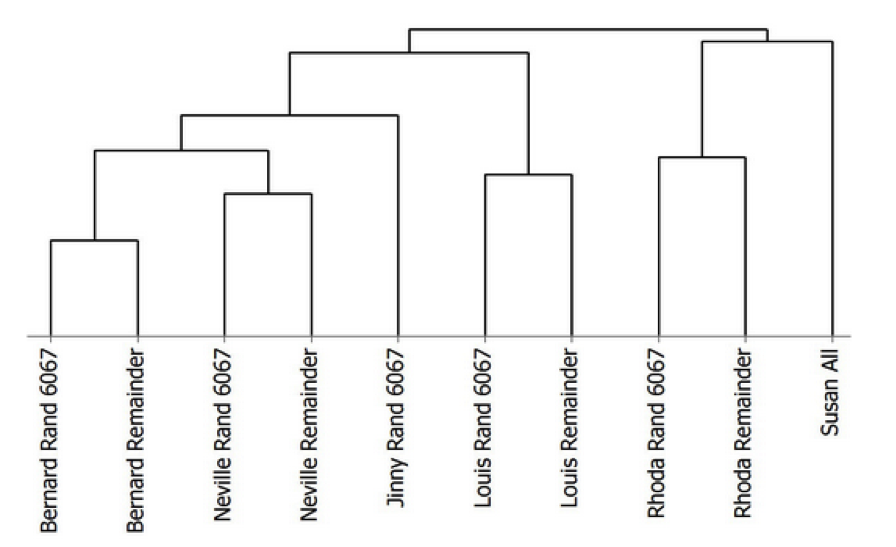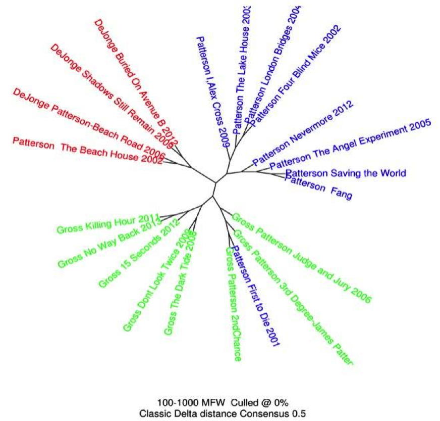 JAMES O’SULLIVAN (Cork, PA, USA) and SIMON FULLER (Maynooth, Ireland) are looking at how much of the actual writing is done by every co-author. Using a "bootstrap consensus tree" cluster analysis over maximum frequency words with the Burrow’s Delta metric, the novels can be classified by main authors (see Fig. 1). The data suggest that the bulk of the actual writing is done by Patterson’s collaborators, which is often observed in “literary assembly lanes”2. We can trace back the industrialization of the literary production process to famous names such as Alexandre Dumas. Patterson provides a striking example where the capitalist system has been applied to produce books with plot-oriented storytelling in a very efficient way.