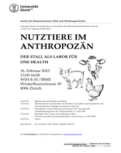 In dieser gemeinsamen Veranstaltung des Lehrstuhls für Medizingeschichte und des Archivs für Agrargeschichte Bern (AfA) soll die Zusammenarbeit des SNF-Forschungsprojekts "Nutztiere im Anthropozän. Der Stall als Labor für One Health" und des Archivs für Agrargeschichte vertieft werden. Die Präsentationen der drei Teilprojekte bearbeitet durch Beat Bächi, Sara Müller und Henrik Jochum werden dabei von Juri Auderset (AfA), Peter Moser (AfA) und Isabelle Schürch (Universität Bern) kommentiert.