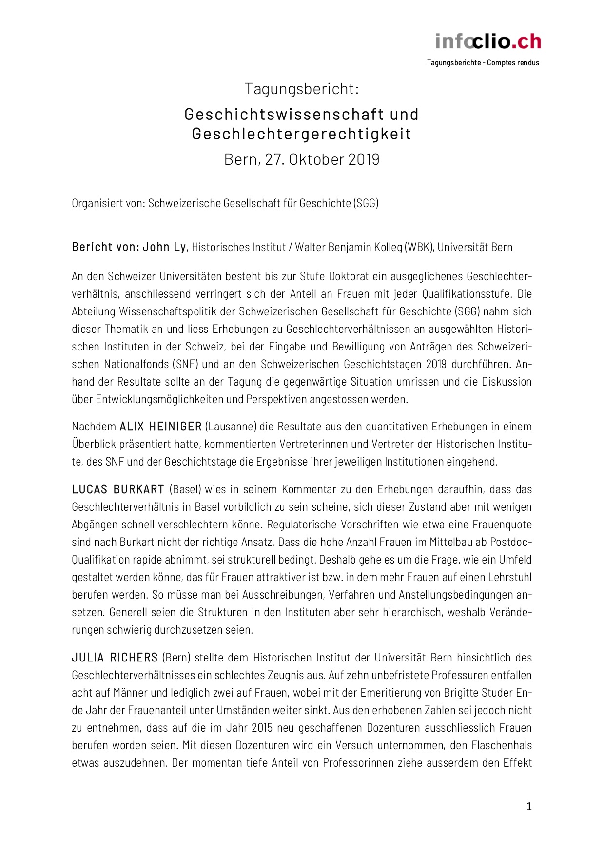 Die Abteilung Wissenschaftspolitik der Schweizerischen Gesellschaft für Geschichte (SGG) organisierte am 27. September 2019 in Bern eine Veranstaltung, um die Geschlechtergerechtigkeit in den Geschichtswissenschaften zu thematisiert. Ausgehend von Erhebungen zu Geschlechterverhältnissen an ausgewählten Historischen Instituten in der Schweiz, bei der Eingabe und Bewilligung von SNF-Anträgen und an den Schweizerischen Geschichtstagen wurde die gegenwärtige Situation aufgezeigt und anschliessend über Entwicklungsmöglichkeiten und Perspektiven diskutiert.