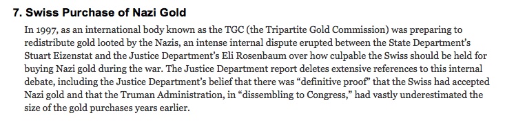Cette fois ce n'est pas Wikileaks, mais le New York Times et le National Security Archive qui ont publié l'affaire: Un rapport secret du Justice Department américain qui révèle, entre autres, la succession d'évènements qui ont abouti à la crise des fonds juifs entre la Suisse et l'Amérique en 1997.