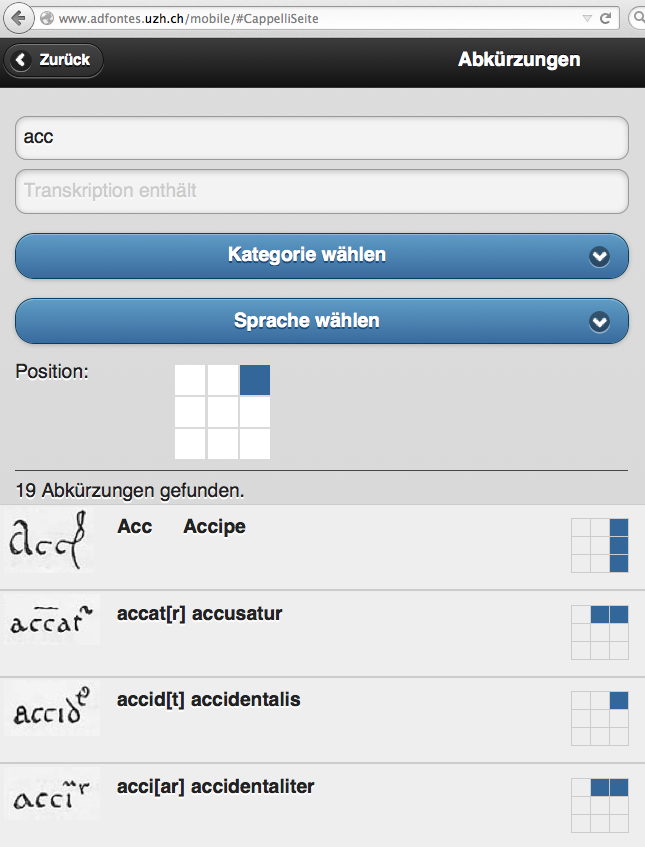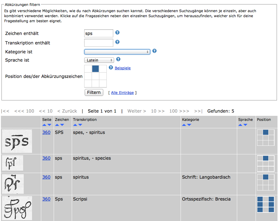 Die Suchoberfläche erlaubt nicht nur eine Suche nach den entzifferbaren Zeichen mit der Möglichkeit, für nicht lesbare Zeichen Platzhalter zu setzen, sondern auch die Suche nach visuellen Kriterien. Mithilfe eines Gitternetz-Schemas mit 9 Feldern wurden die Abkürzungen nach visuellen Auffälligkeiten strukturiert und durchsuchbar gemacht.