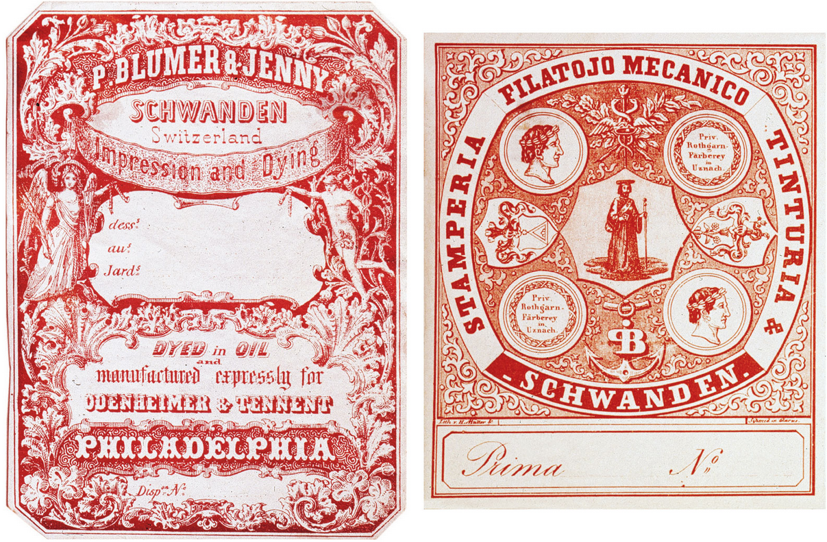 Etiquettes (env. 1880) Blumer & Jenny Schwanden, pour des textiles exportés aux Etats-Unis et en Amérique du Sud (Collection privée), in Dictionnaire historique de la Suisse, article "Commerce extérieur".