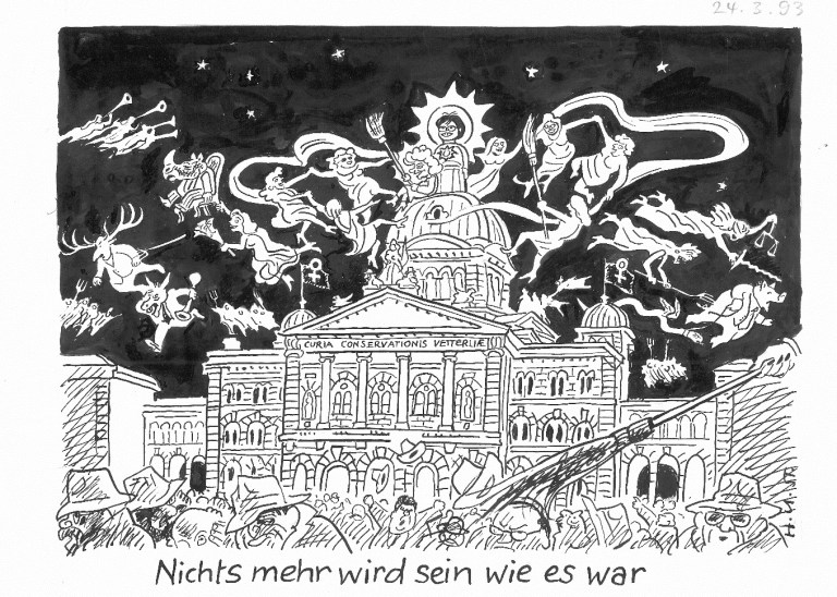 Bild: Karikatur von Hans U. Steger «Nichts mehr wird sein wie es war», erschienen im Tages-Anzeiger vom 24. März 1993, in: AfZ NL Hans U Steger / 1535.