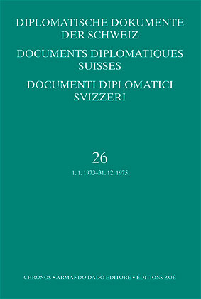 Il volume 26 (1973–1975) documenta l’importanza crescente delle soluzioni multi laterali nelle relazioni esterne della Svizzera: le conseguenze della crisi petrolifera accentuano il bisogno di regolamentazione, in particolare nell’ambito monetario e dell’energia, e conducono ad un allentamento nell’interpretazione della neutralità. Nel gennaio del 1973 viene abbandonato il cambio fisso del franco. La politica d’asilo e degli stranieri vengono altresì messe alla prova. Sul piano della politica europea, l’allargamento delle Comunità europee rappresenta una sfida per la Svizzera, la quale peraltro ratifica, nel 1974, la Convenzione europea dei diritti dell’uomo. La firma dell’Atto finale della CSCE, il 1o agosto 1975 ad Helsinki, rappresenta una pietra miliare per la politica estera svizzera.