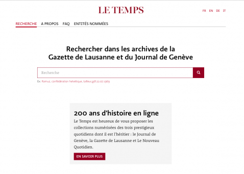 Les archives historiques du journal Le Temps ont développé en collaboration avec le DH Lab de l'EPFL une nouvelle interface pour consulter les collections numérisées des trois quotidiens dont il est l’héritier: le Journal de Genève (1826-1998), la Gazette de Lausanne (1798-1998) et le Nouveau Quotidien (1992-1998).