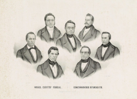 Eidgenössischer Bundesrath 1848-1845, Schweizer Nationalbibliothek, Graphische Sammlung, Signatur: GS_Eid­genös­sischer_Bundesrath_1848-1854. Foto: Die sieben ersten Bundesräte, gewählt am 16. November 1848: Oben v.l.: Henri…