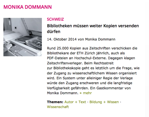 Prof. Dr. Monika Dommann hat einen Gastkommentar über den Rechtsstreit um den Dokumentenlieferdienst zwischen der ETH-Bibliothek und verschiedenen Zeitschriftenverlegern auf der Plattform irights.info veröffentlicht.
