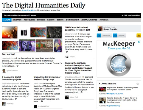 Le Digital Humanties Daily est un quotidien en ligne sur les Digital Humanities édité par Susan Frankin, Senior Research Analyst auprès des bibliothèques et archives du Canada.