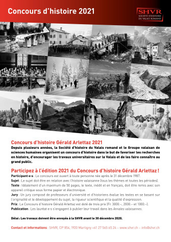 Depuis plusieurs années, la Société d’histoire du Valais romand et le Groupe valaisan de sciences humaines organisent un concours d’histoire dans le but de favoriser les recherches en histoire, d’encourager les travaux…